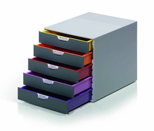 Ensiluokkaisesta muovista valmistettu lomakelaatikosto, jossaonviisi värikästä laatikkoa helpottamaan esimerkiksi papereidenvärikoodausta. Laatikot aukeavat pehmeästi ja äänettömästi. Laatikostojavoidaan pinota päällekkäin ja niissä on naarmuttamattomat luistamistaestävät tassut alla. Mitat: 292 x 280 x 356 mm.