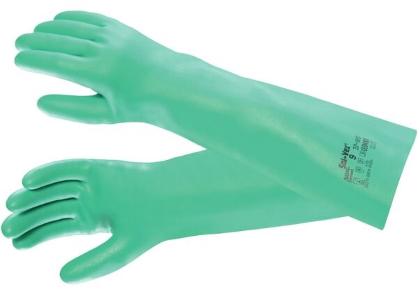 Vahva kemikaalinkestokäsine kyynärpäähän ulottuvalla rannekkeella.Vihreä nitriilikäsine, karhennettu kämmen, nukaton sisäpinta. Tehokassuoja useita liuottimia, öljyjä ja rasvoja vastaan. Pituus: 455 mm.Paksuus: 0,56 mm. CE – kategoria III. Hyväksytty elintarviketeollisuudenkäyttöön EN 1935/2004 mukaisesti. Myyntierä 1 pr (12 pr/pss).