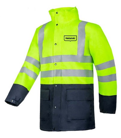 Helsinki Sadetakki huomio kelt.Helsinki Sadetakki huomio, Helsinki painatuksilla. on sekä hengittävä,vedenpitävä että optimaalisen näkyvyyden sadetakki. Sisällä olevakosteutta imevä pinnoite ja kainalon ilmanvaihto estävät tahmeutta.Huppu voidaan piilottaa kaulukseen ja vetoketju on piilotettupainonepparein varustetun läpän alle. Veden- ja tuulenpitävässäsadetakissa on kaksi taskua ja joustava hihat, jotka voidaan kaventaapainoneppareilla.Ominaisuudet: Piilotettava huppu kauluksessa,vetoketjusuljentanapillisella tuulilistalla,kaksi sisätaskua,joustavat hihansuut,kainaloissa ilmanvaihtoaukot,sisällä verkkovuori ja polyamidia hihoissa.Väri: kelta-navySertifioitu:EN ISO 20471 Class 3, EN 343, EN ISO 13688Materiaali 100 prosenttia polyesteria,100 prosenttinen PU pinnoiteella.Hakusana: Sadetakki,Helsinki